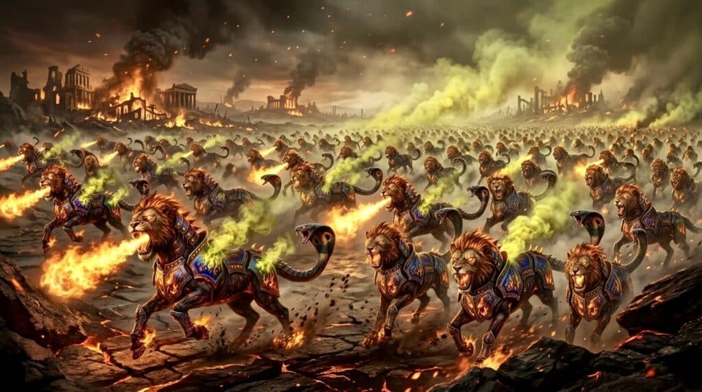 这三样灾害带来了极大的毁灭:“口中所出来的火与烟并硫磺,这三样灾杀了人的三分之一。”(启示录 9:18)。这样的描写让人联想到旧约中神对罪恶城市所施行的审判,例如神毁灭所多玛和蛾摩拉的时候,“耶和华将硫磺与火,从天上耶和华那里降与所多玛和蛾摩拉”(创世记 19:24)。此外,经文还说这些马的能力不仅在口中,也在尾巴上:“这马的能力是在口里和尾巴上;因这尾巴像蛇,并且有头,用以害人。”(启示录 9:19)。蛇在圣经中常常象征邪恶与欺骗(创世记 3:1),因此这些形象进一步表明,这场灾祸与邪恶的属灵势力密切相关。
